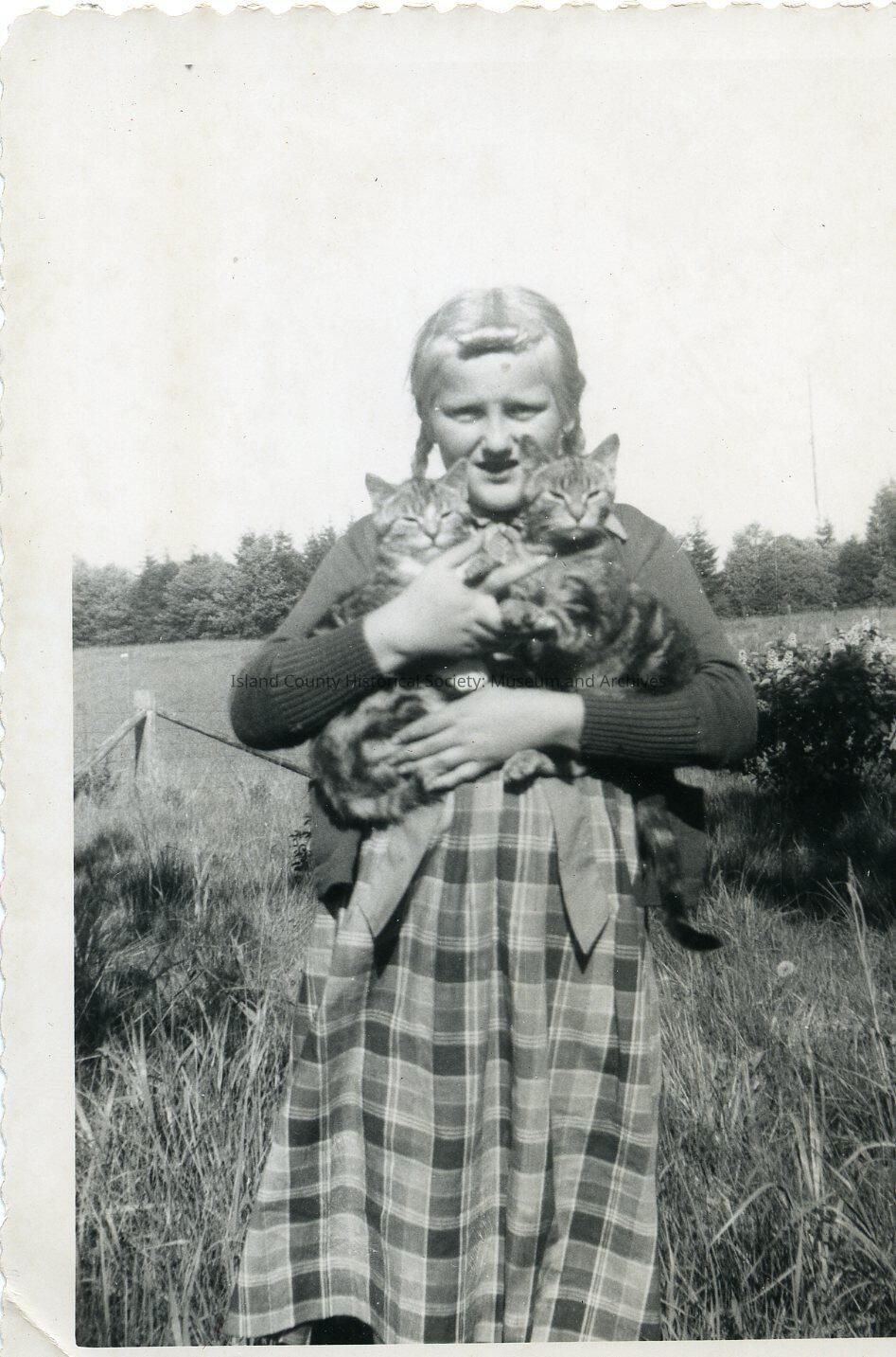 Karla Anderson with her cats, Sheba and Stinkey. Karla is likelly around 10-12. Field and line of trees in distance. Photo has crinkled edging all the way around.
