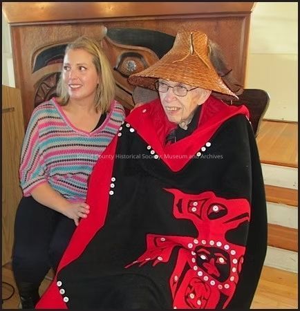 Roger Purdue in button blanket and cedar hat (on display in Native People, Native Places exhibit)Photograph Details