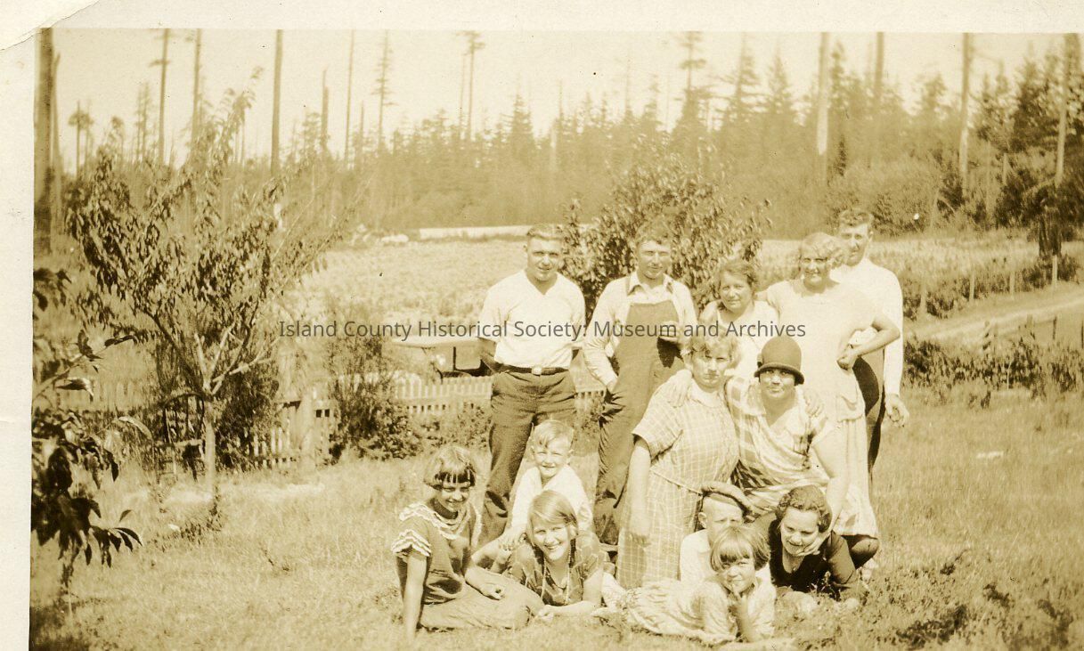 Front Row: Second from the left is Elizabeth Anderson. Mary Autio is standing. Walter Autio and Fina Sandstrom. It looks as though they are having a picnic near the Christenson house. Christenson Road is likely the road in the background. In album it came from: "Seattle folk visiting Christensen farm" . 1923.