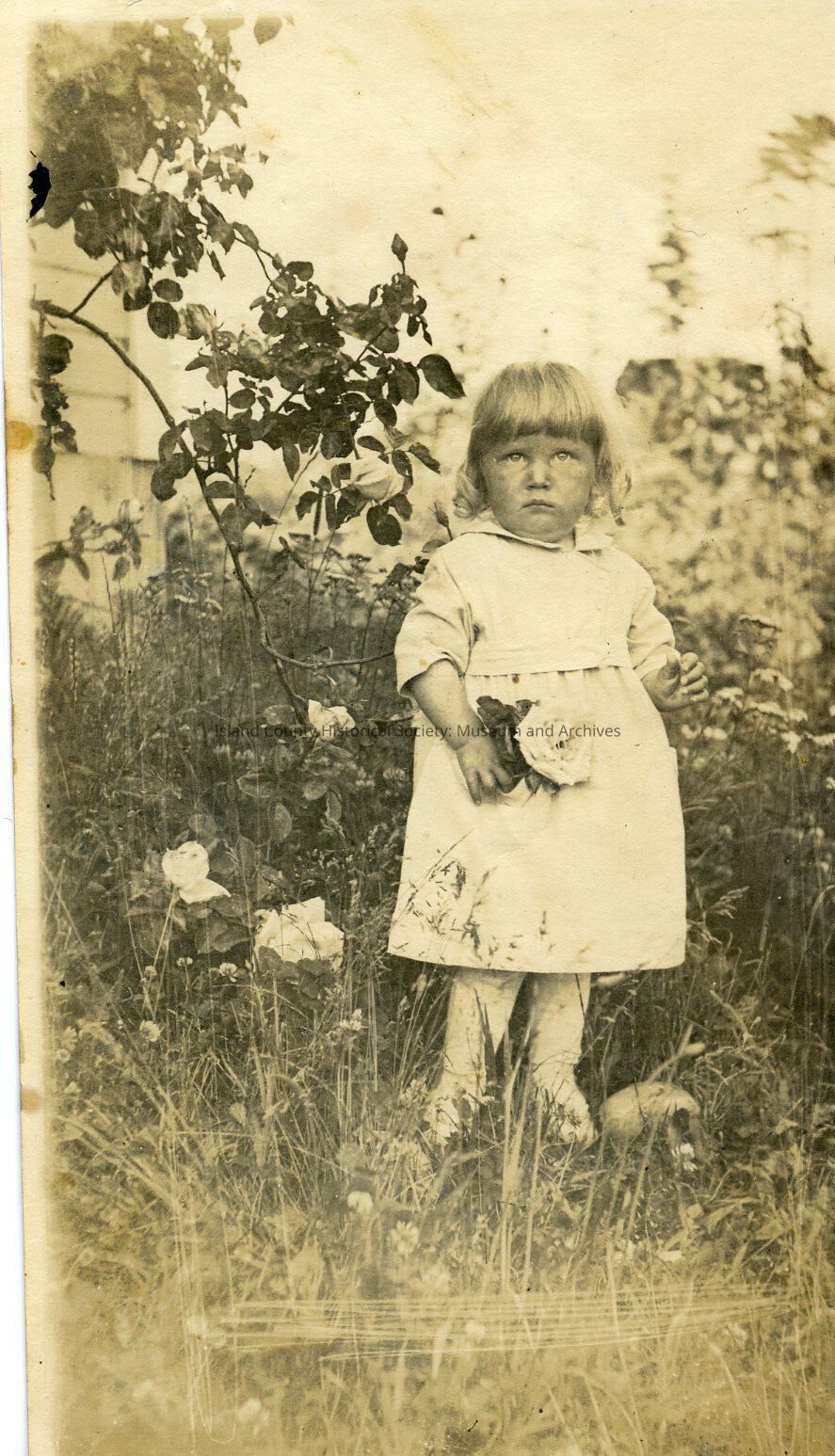 Photo of young girl. On back "x7 Grace Christosen taken at Greenbank". Girl with short blond hair and fringe to her eyebrows, dressed all in white and holding a large white flower. Glimpse of female figure on right. The girl is surrounded by shrubbery. Glimpse of building on left, behind the branches.