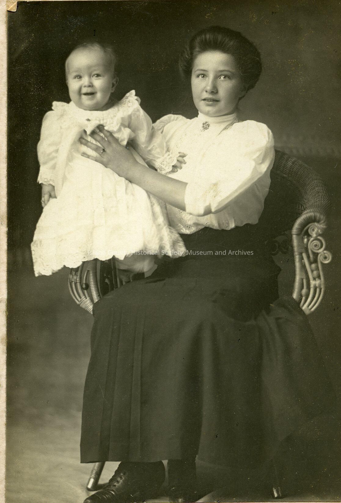 Mrs. Leetola with baby Frank (? one of her children) (This differs from what is written on the back, which claims that the child is Albert). Karla recalls she had the most wonderful hands. Back of photo states this was taken in Lead, South Dakota - possibly in 1911. Studio photo.