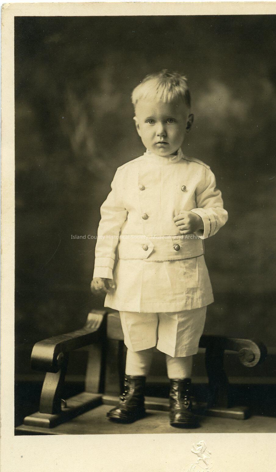 Frank Leetola? Back of photo it says it is William Leetola. A postcard, studio produced (Myers, Everett). Boy with blond hair wearing a white buttoned suit with black leather boots, standing on a bench (or other form of seat).