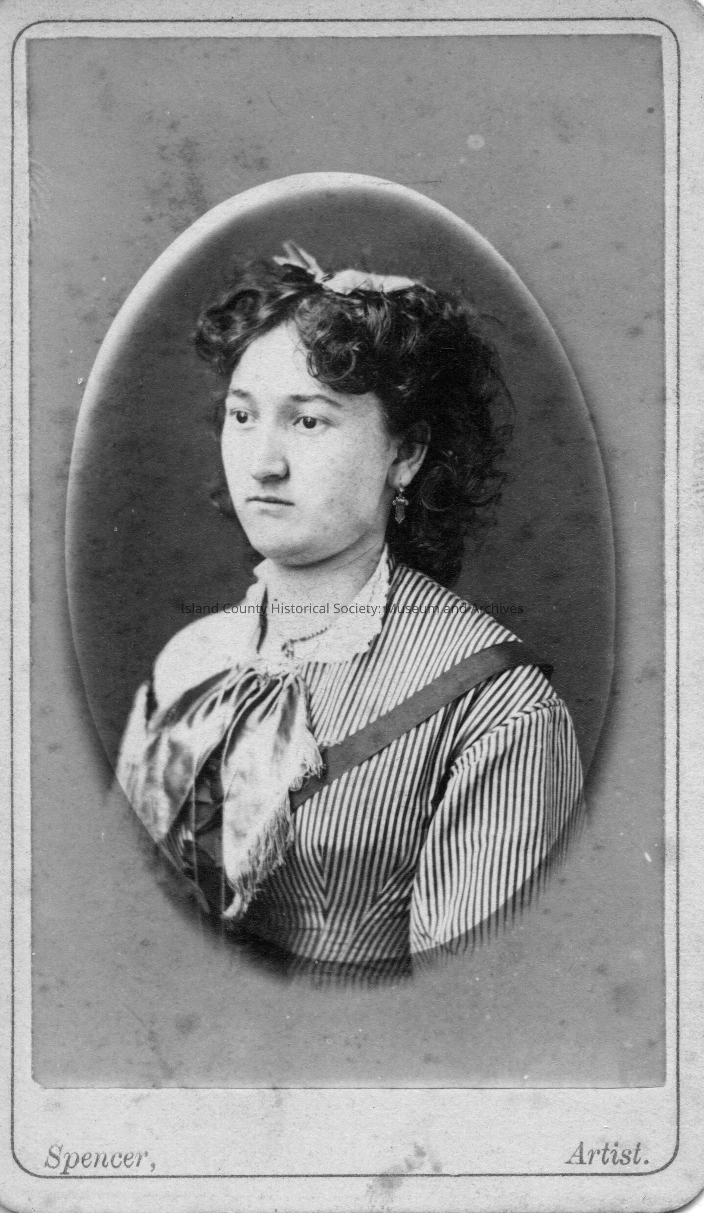 Portrait of young woman wearing striped dress with white collar and tie. Her dark hair is curly with a bow on top. She wears earrings. Note on back: Mrs. Lloyd (1st). 1874 marriage record lists Florence Harned.