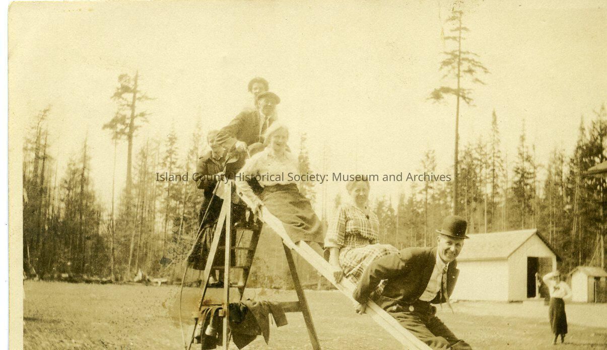 Playground at the schoolhouse- now the Greenbank Club House. Aunty Mary Autio is the woman in the white blouse at the top of the slide. Mr Day and his wife. Mrs Jackson and Mrs Leetola. 4th of July picnic. 1921. From Pearl Anderson.