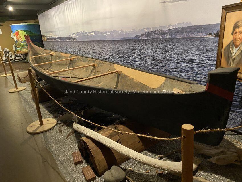 On top is a War Canoe - believed to the the oldest dugout in the State of Washington. It was made by Sam Wick in the early 1850s. First used by Snetlum, Chief of the Skagit Tribe, to which Sam Wick belonged. The first Chief Snetlum died Dec. 16, 1852. His son Charlie became Chief (known as Big Charlie) died June 5, 1857. His son George became Chief - died - 1880. Charlie Snetlum Jr. (called Long Charlie) was the last Chief. He died in 1934. All are buried in a private cemetery near Snakelum Point. Above names and dates were taken from records kept by Capt. Robert C. Fay, Indian Agent 1850-1861. (In later years the spelling of the name and point was Snakelum.Collection