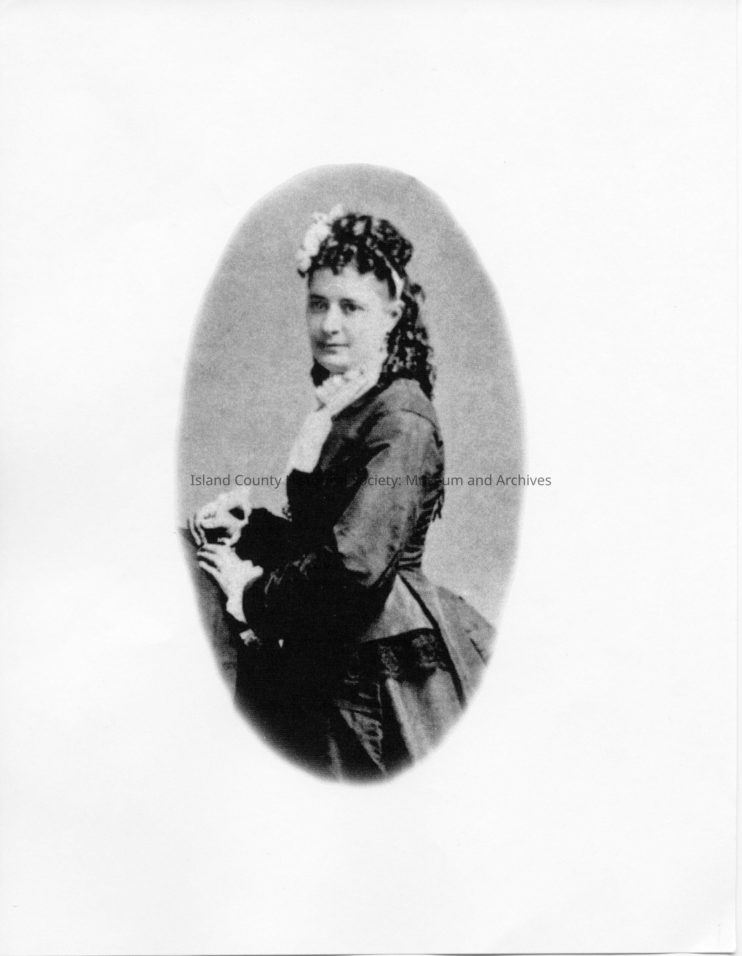 Portrait of Flora Pearson Engle wearing a large dark dress and a curly hairstyle.