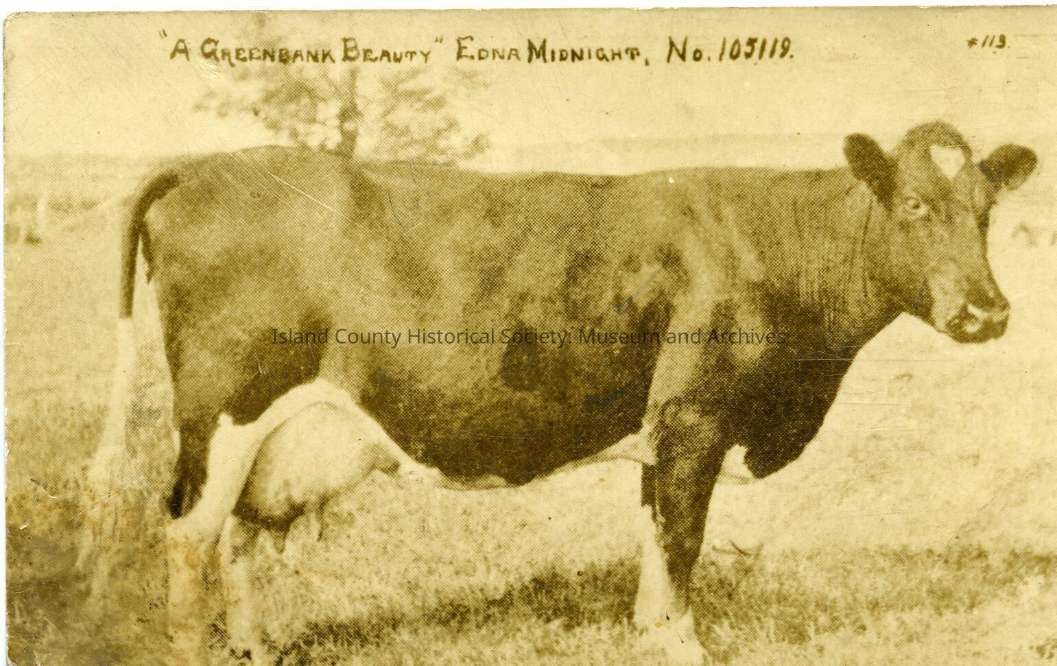 A Greenbank Beauty, Edna Midnight- name of postcard. Large cow. Used postcard- addressed to Liss Elli Sandstrom . Stamped September 5th 1918. Letter written in Finnish, mentioning Seattle and Walter. Left bottom corner missing.