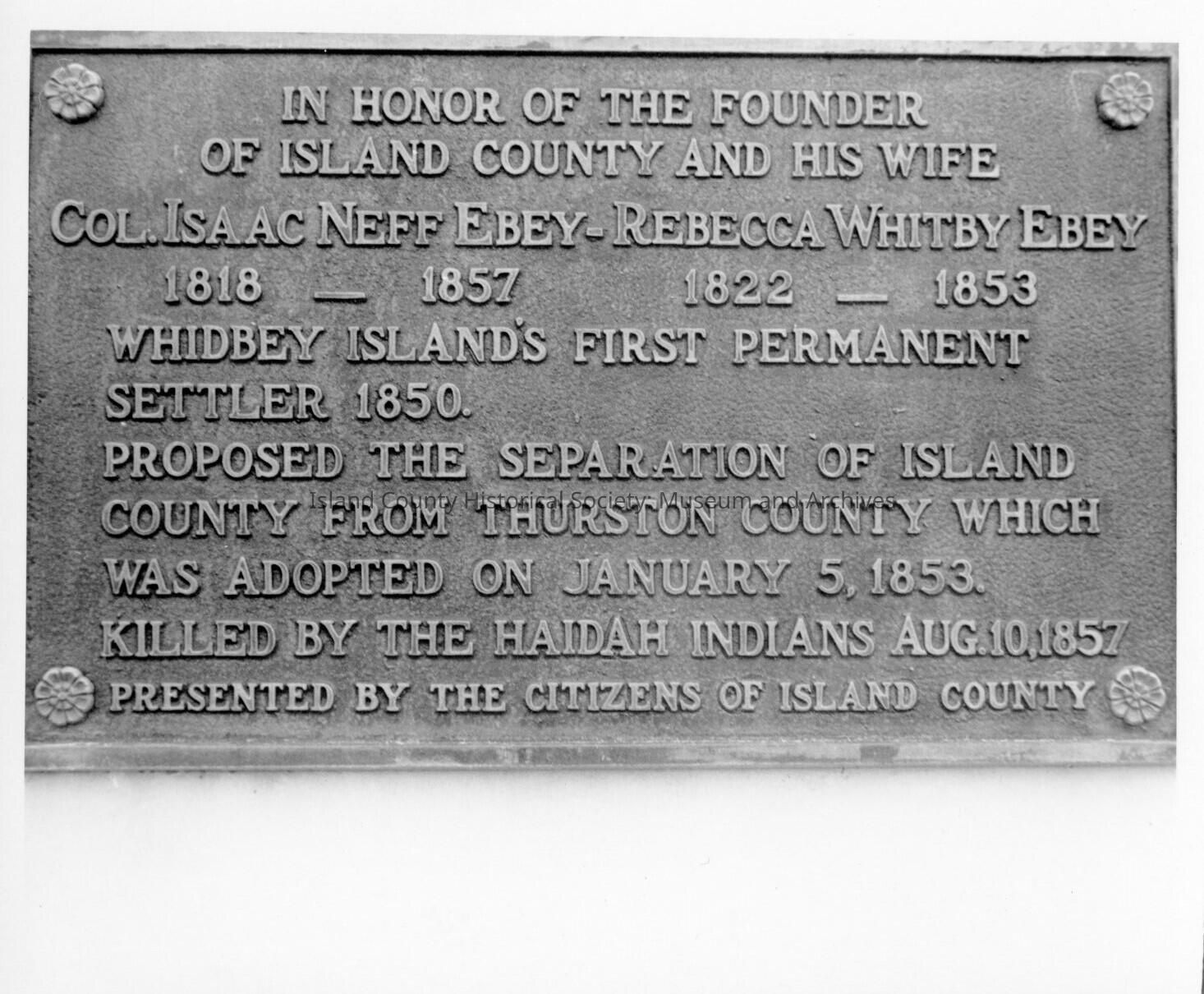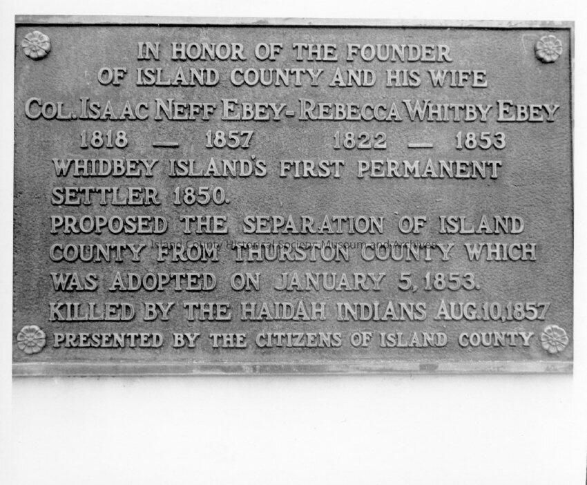 Photo of a plaque in honor of Col. Isaac Neff Ebey and Rebecca Whitby Ebey