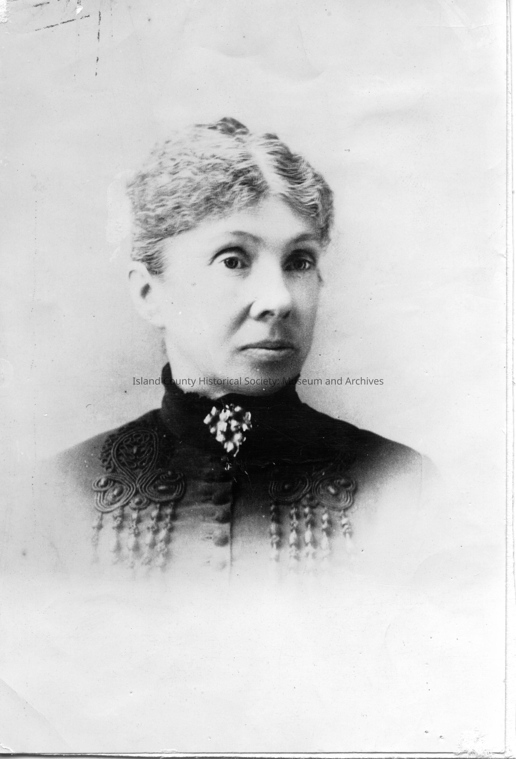 Head portrait of woman in dark high-collared dress with jewelry at throat. Calista Kinney Lovejoy., wife of Capt. Howard B. Lovejoy. (m. name Leach) (partial words: first American w... visit Alaska)