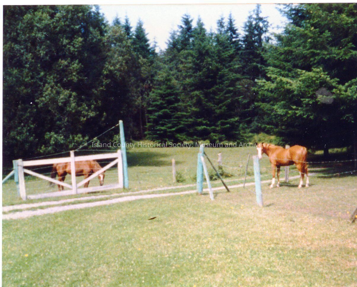 Horses owned by the Coupes' on the Autio property. They boarded there. Two roan(?) horses with white noses and feet enclosed within wire fencing (poles are painted light blue and gate painted white). Tall trees in background.