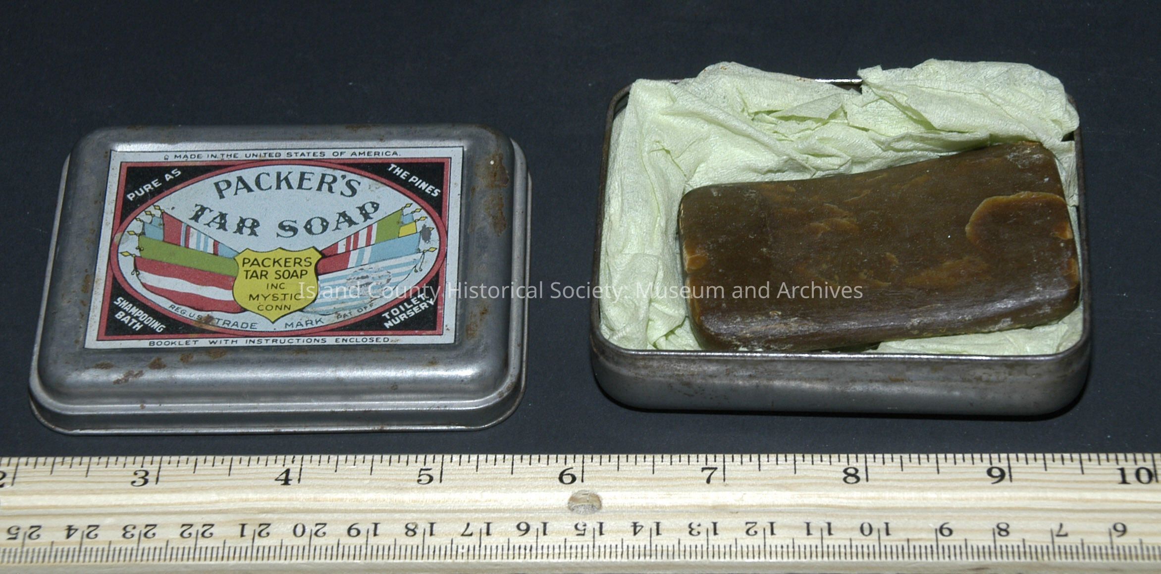 Soap Dish and Soap. Packers Tar Soap in tin case. 71-70-A Leather razor strop A-1 mercury Mfg. 71-70-B Leather razor strop Puget Sound Notion Company.