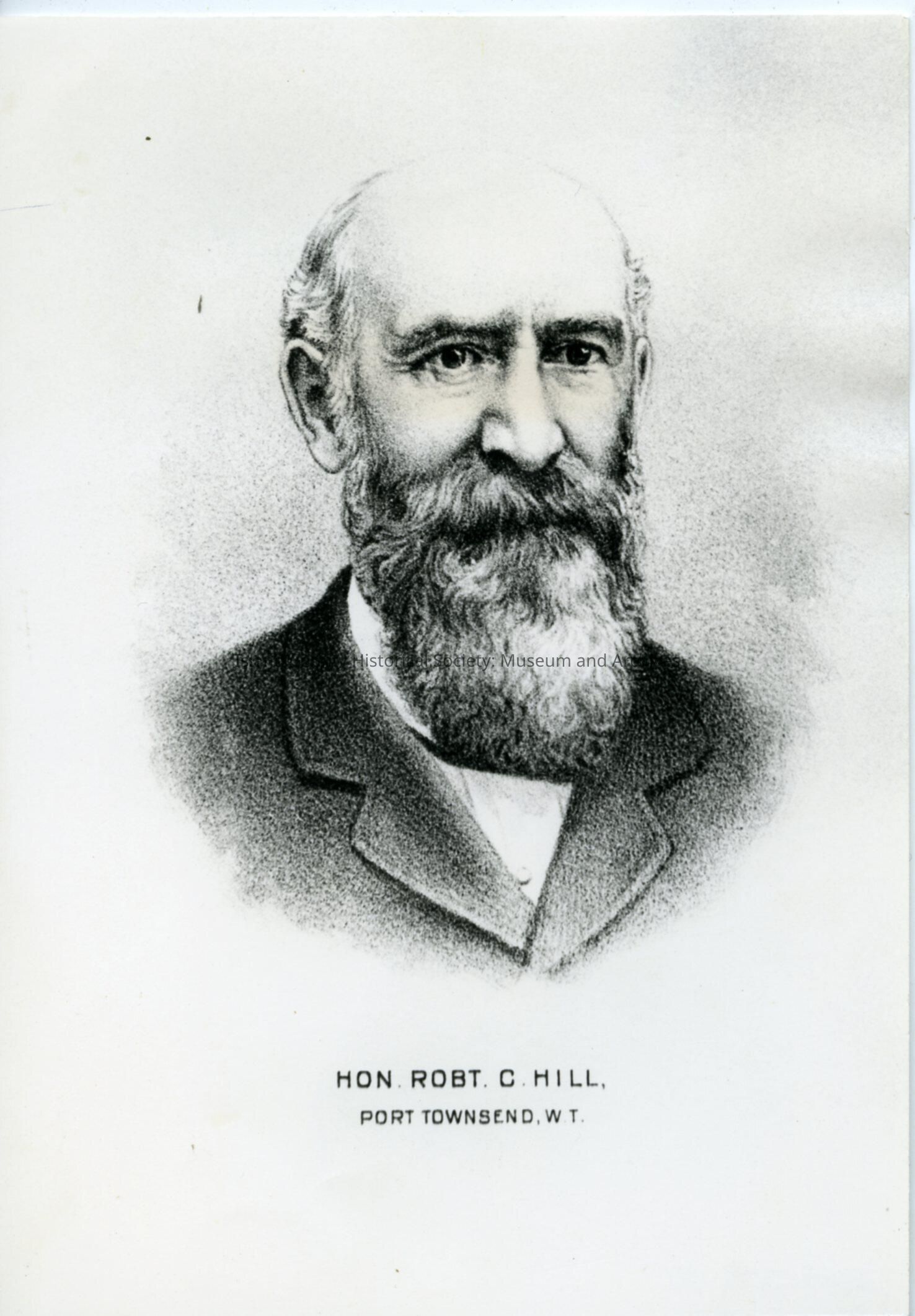 Black & white photograph of a portrait sketch/drawing of Hon. Robert C. Hill, Port Townsend. The sketch depicts an elderly man with a bald head and long gray beard. No date.