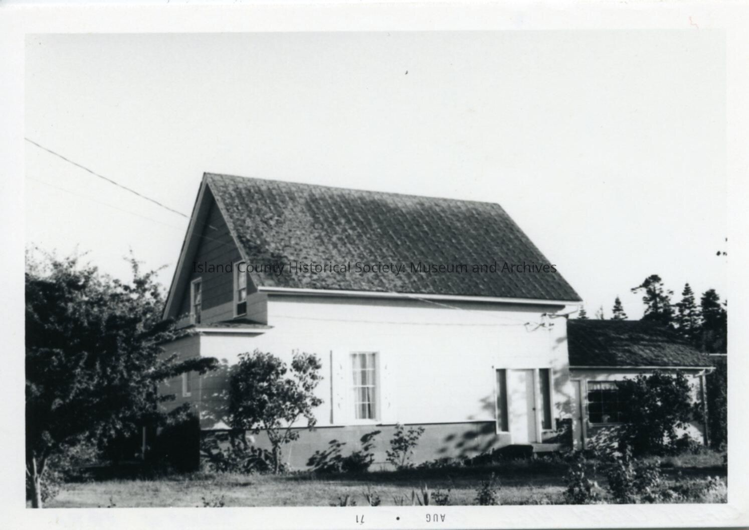 Black & white photograph of the Robert C. Hill home. It is a photo of one side of the white clapboard house showing one window on the left and a door on the right. It has a dark roof. Taken August, 1971. There are 3 photos taken at the same time. 152a & b are the same size - 5'"W x 3.5"H. 152c is slightly larger - 5"W x 4"H and has tape on the four corners.