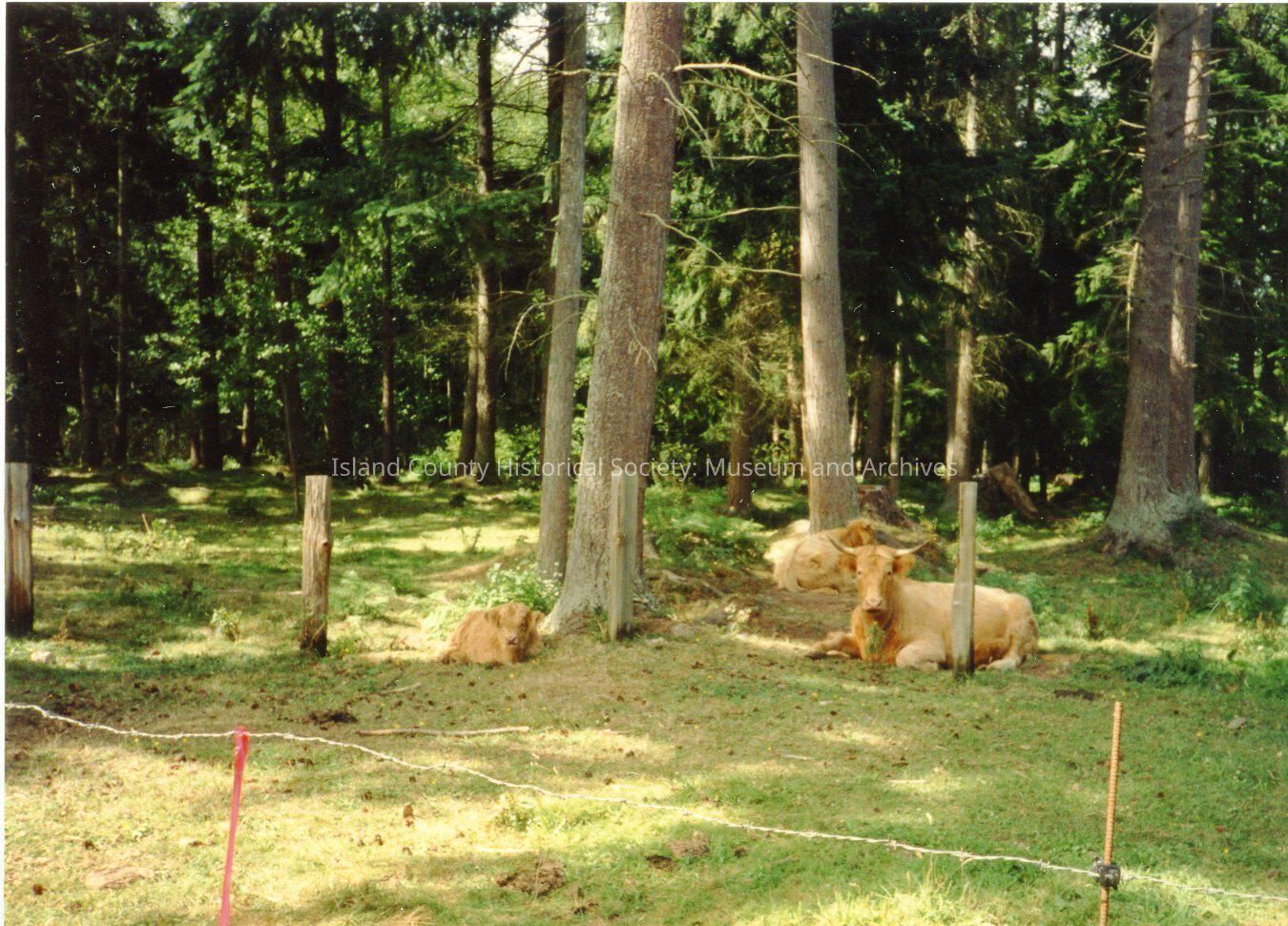 Glen and Jan Russel's cow. The property is adjoined to the Maki and the Bakken property. Three cows (including at least one calf) rest in the shade of tall trees in a forest clearing/edge of a forest. Barbed fence in foreground.