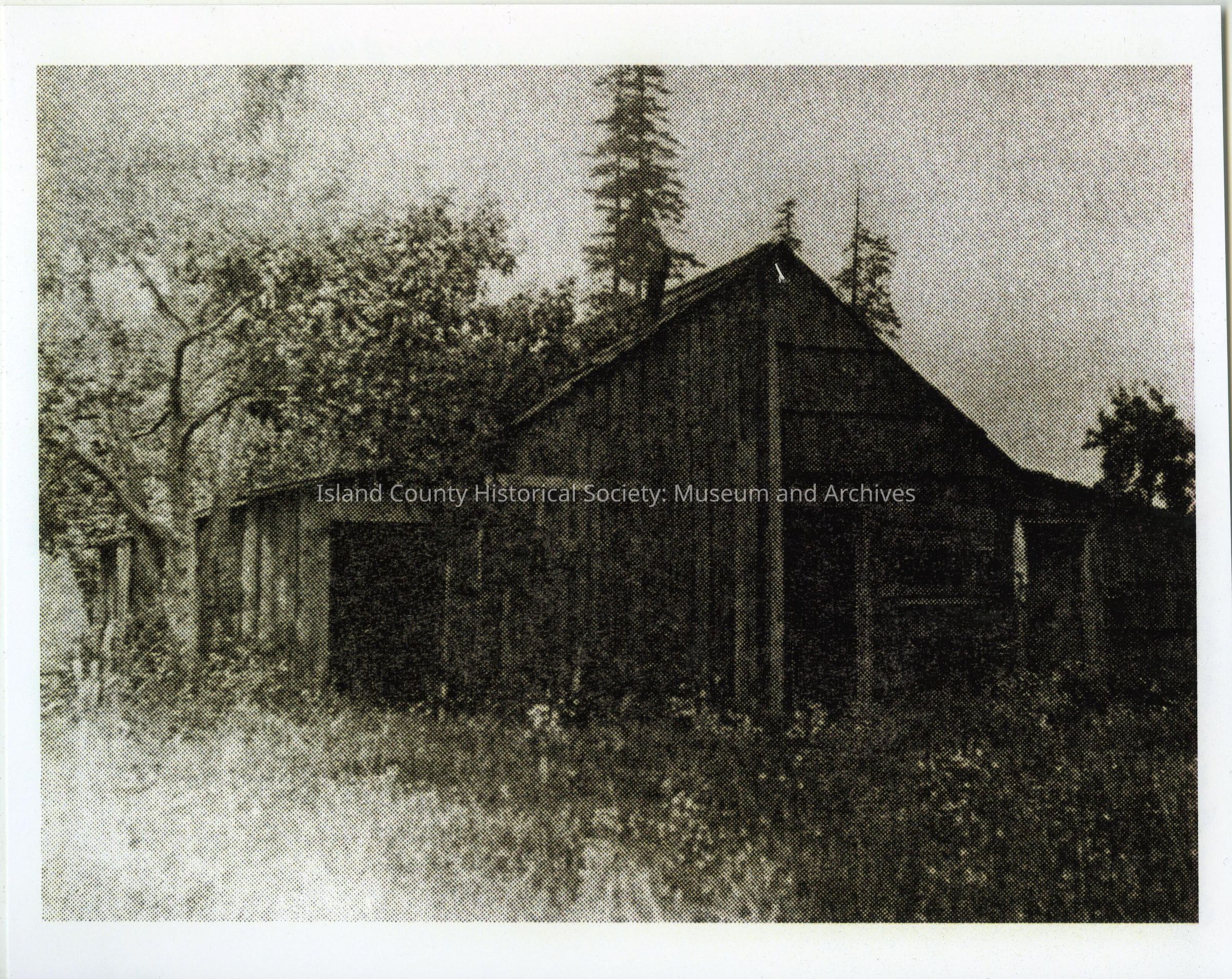 Black & white photograph of the Edward Hinman cook house - 1887-1880. It is a photo of a wood sided barn-like structure in a field. The structure is deteriorating. On the back: 1887-1880 and 1887-1890.