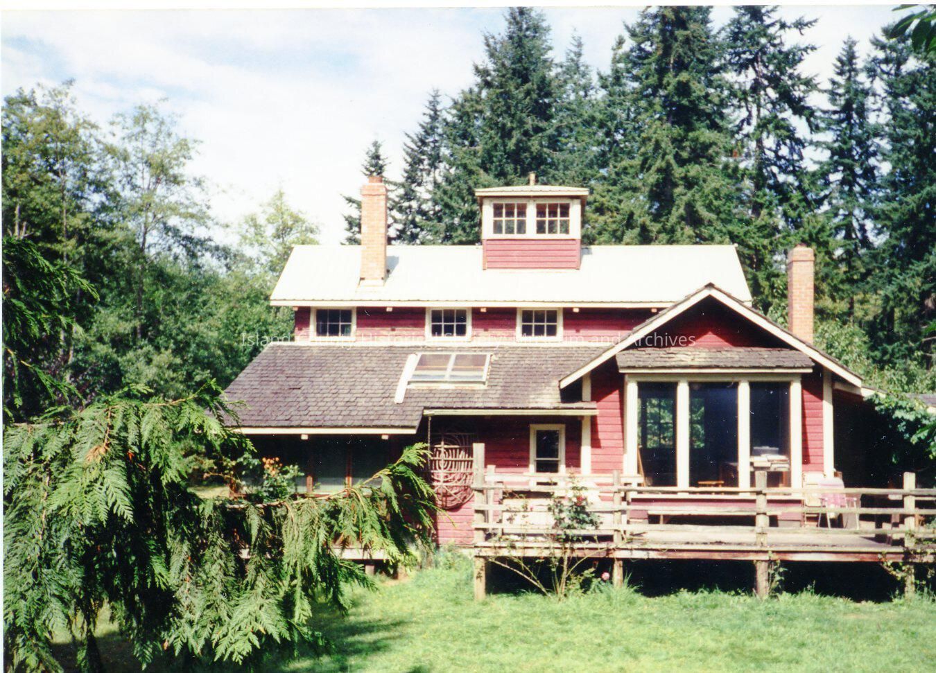 This is Glen Russel's house. It started as a two room cabin and it was added to and added to and added to. The property likely was originally owned by the Stewarts. The back of the house with porch/deck above a lawn. Painted red with white trim. Two brick chimneys. Two or three floors. Tall trees surround.