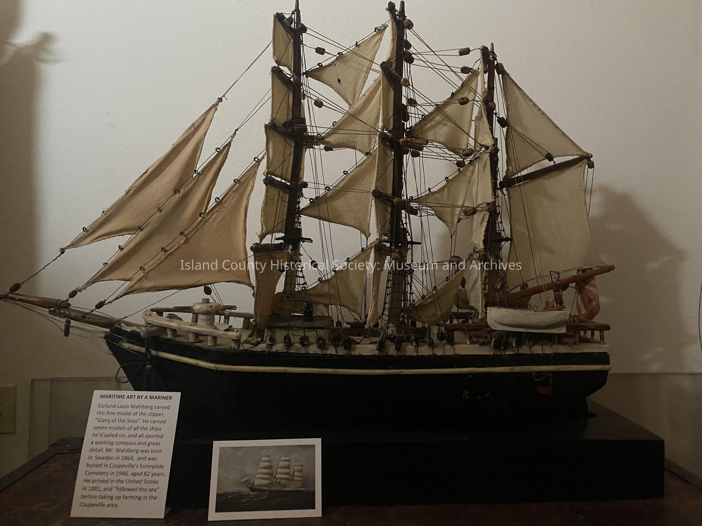 Earlund Louis Wahlberg carved this fine model of the clipper, "Glory of the Seas". He carved seven models of all the ships he'd sailed on, and all sported a working compass and great detail. Mr. Wahlberg was born in Sweden in 1864, and was buried in Coupeville's Sunnyside Cemetary in 1946, aged 82 years. He arrived in the United States in 1881, and "followed the sea" before taking up farming in the Coupeville area.