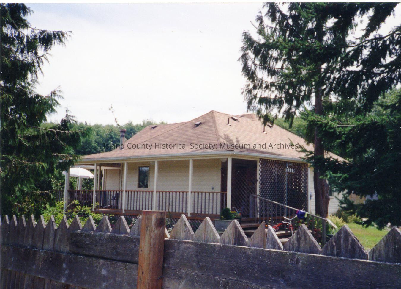 Waino fence and house. Photo is taken over a wooden fence looking at a pale yellow house with wrap-around porch. One storey high and a red tiled roof. Trellising covers one side of the porch with steps descending to the garden. A red bike can be glimpsed on the steps. In the background to the left, an umbrella can be seen. Trees surround the house.