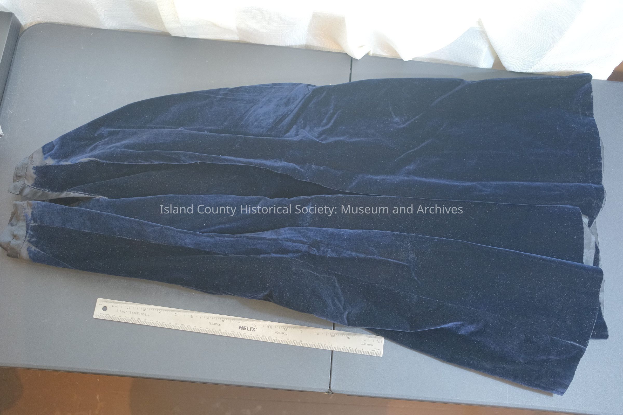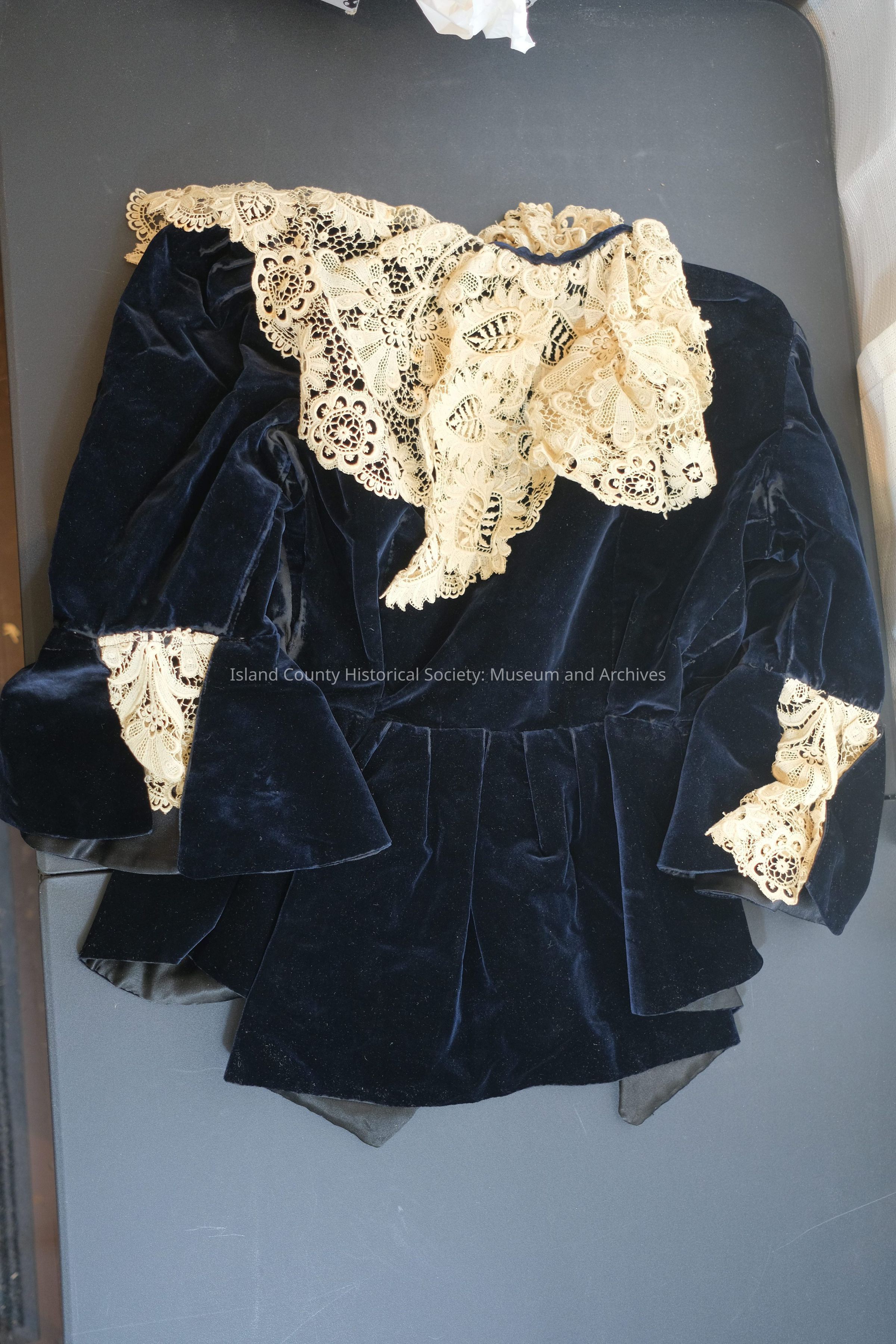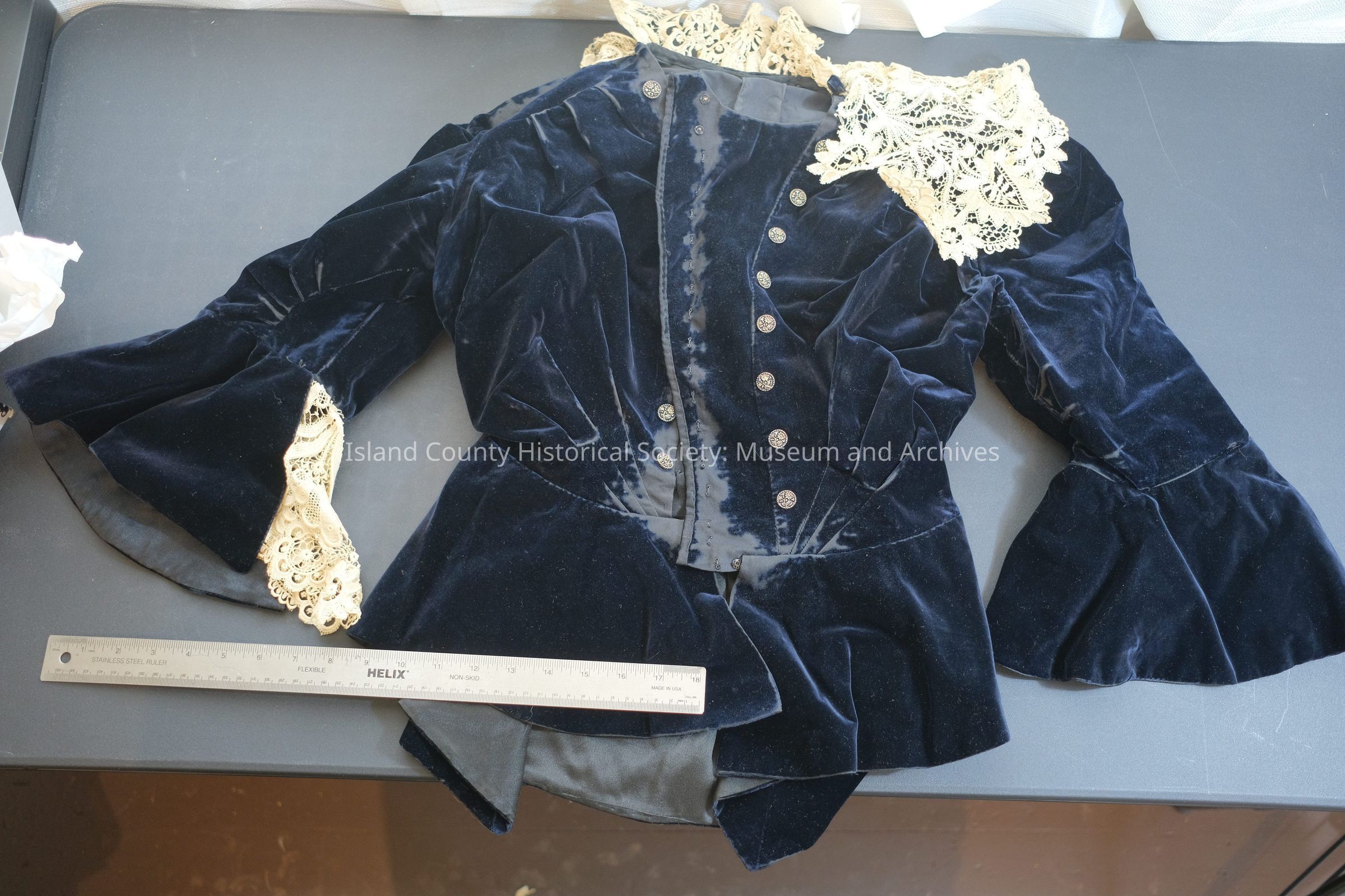 blue velvet top and skirt suit, trimmed w/ swiss lace and steel cut buttons,