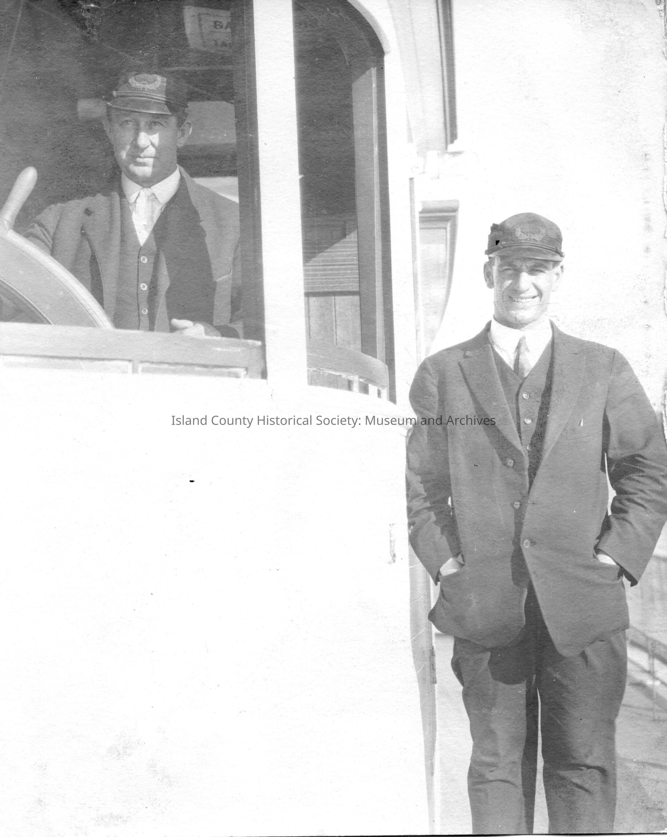 Two men on a ship; man at wheel in wheelhouse and another standing on deck. Written on back: At the wheel is Capt. Lovejoy. The purser is Bertram Robey, father of Jack Robey who was born in Oak Harbor. Taken by his mother.