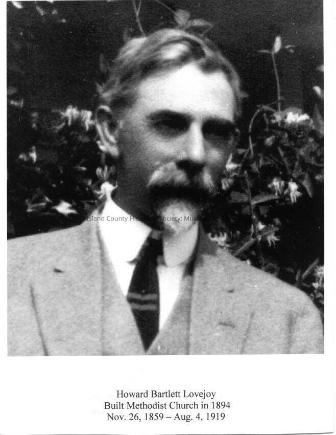 Man standing in front of bushes. Howard Bartlett Lovejoy. Built Methodist Church in 1894. Nov. 26,1859-Aug. 4, 1919.