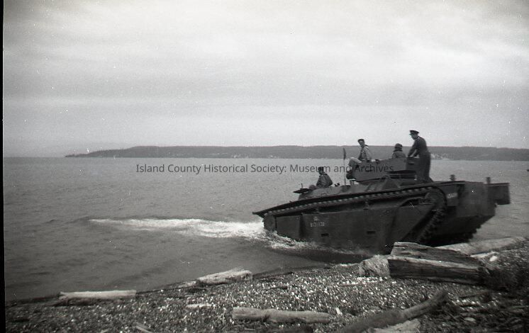 Amphibious vehicle reaching beach. Four men ride atop, facing water. Large driftwood log is directly in front of vehicle. Deed states Negatives of "Turkey Day Festival" 1950.