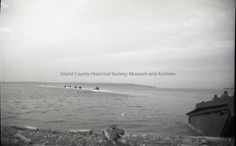 Amphibious vehicle reaching beach on right. Line of other vehicles visible farther off shore. Deed states Negatives of "Turkey Day Festival" 1950.