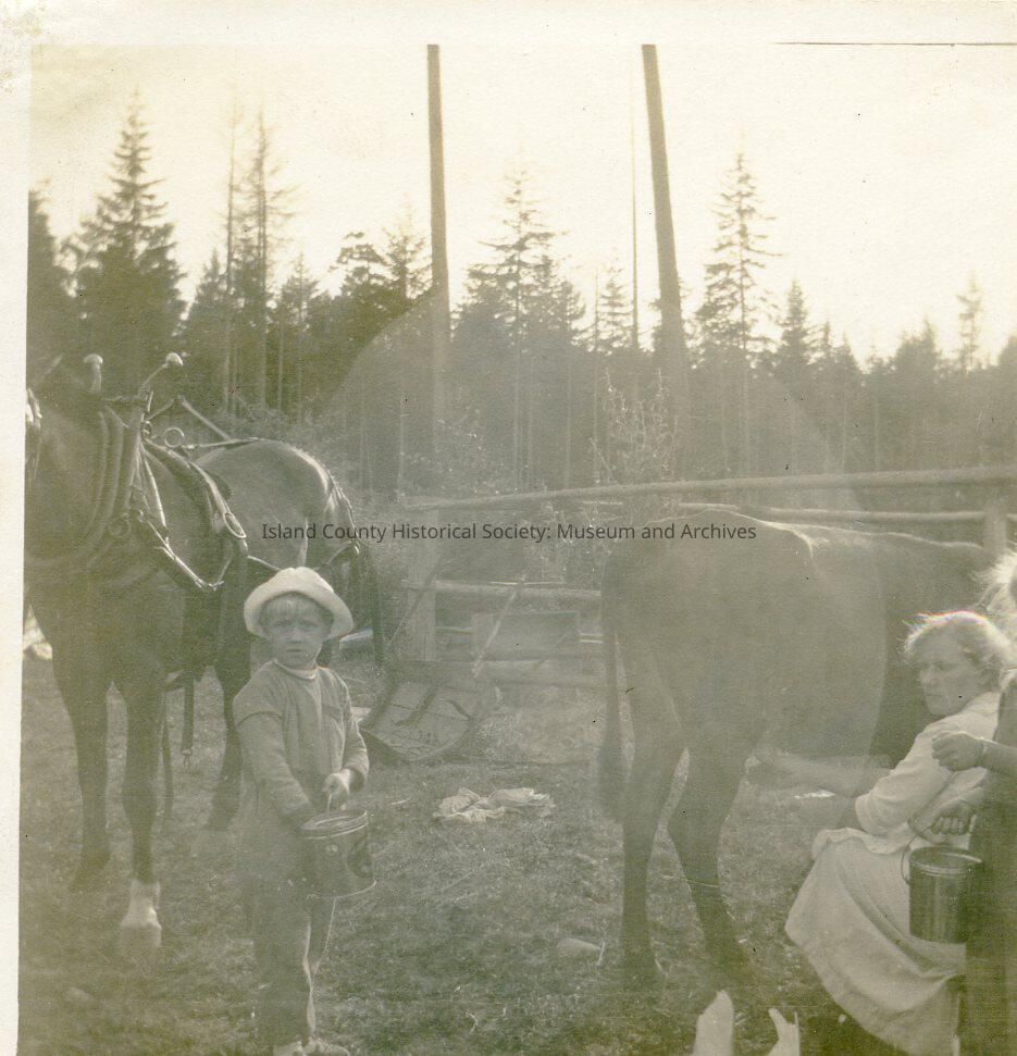 Walter Autio and Mary Autio milking cows on the Autio property. 1916