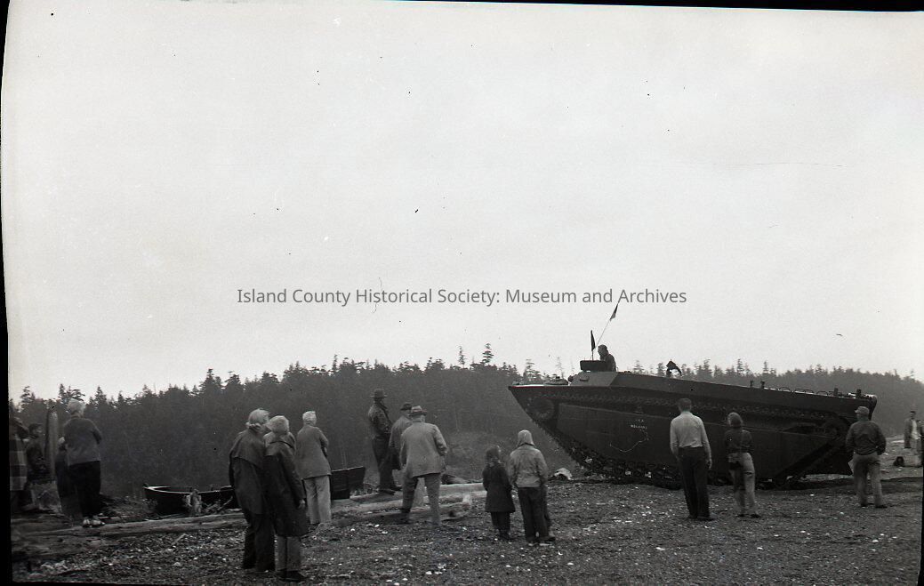 Amphibious vehicle on beach. Men, women, and children stand nearby watching it. Deed states Negatives of "Turkey Day Festival" 1950.