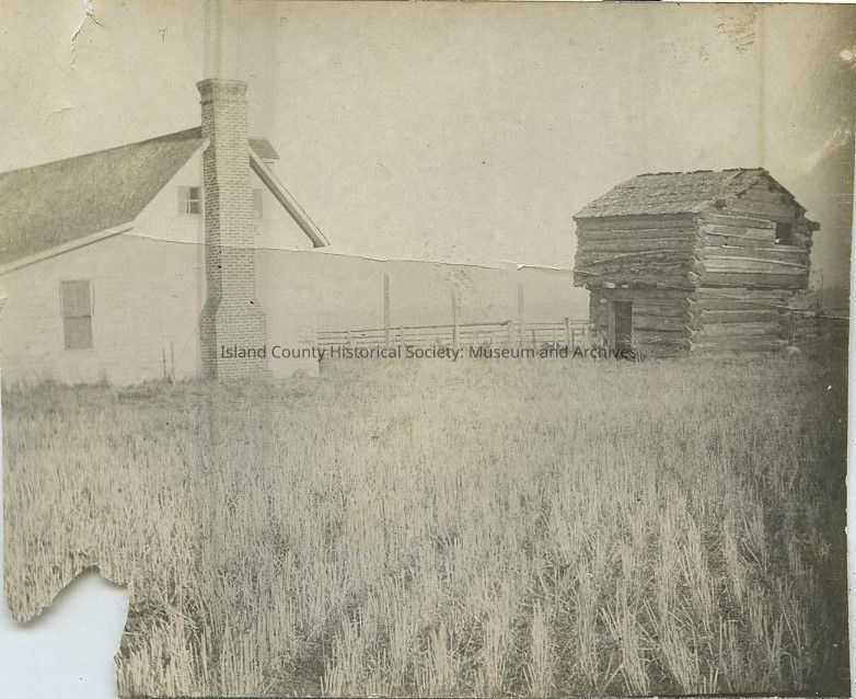 An image showing a modern farmhouse next to Ebey's Blockhouse. Date unknown.