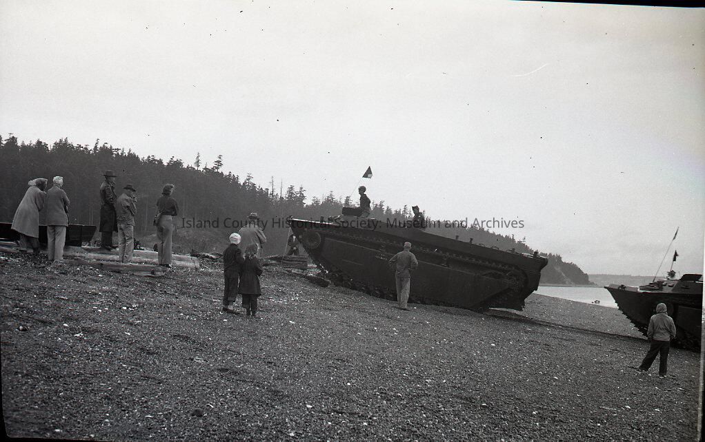 Amphibious vehicle on beach, with another in line behind it. Two soldiers sit on top. Men, women, and children gather on beach to watch. Deed states Negatives of "Turkey Day Festival" 1950.