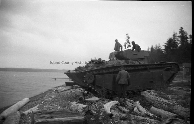 Amphibious vehicle on beach, climbing over driftwood logs. Three men are on top. One man stands on log to watch. Deed states Negatives of "Turkey Day Festival" 1950.