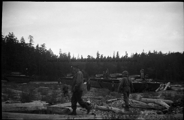 Line of amphibious vehicles on beach. Soldiers walk around in foreground. Deed states Negatives of "Turkey Day Festival" 1950.