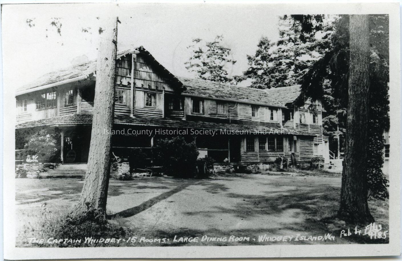 Photo of the Captain Whidbey Inn. Sides are cedar shake and logs; roofs are cedar shake (lots of moss). Wraparound lower porch. Caption: The Captain Whidbey - 15 rooms - large dining room - Whidbey Island, WN. Pub. by Ellis 9185 (or 4185).