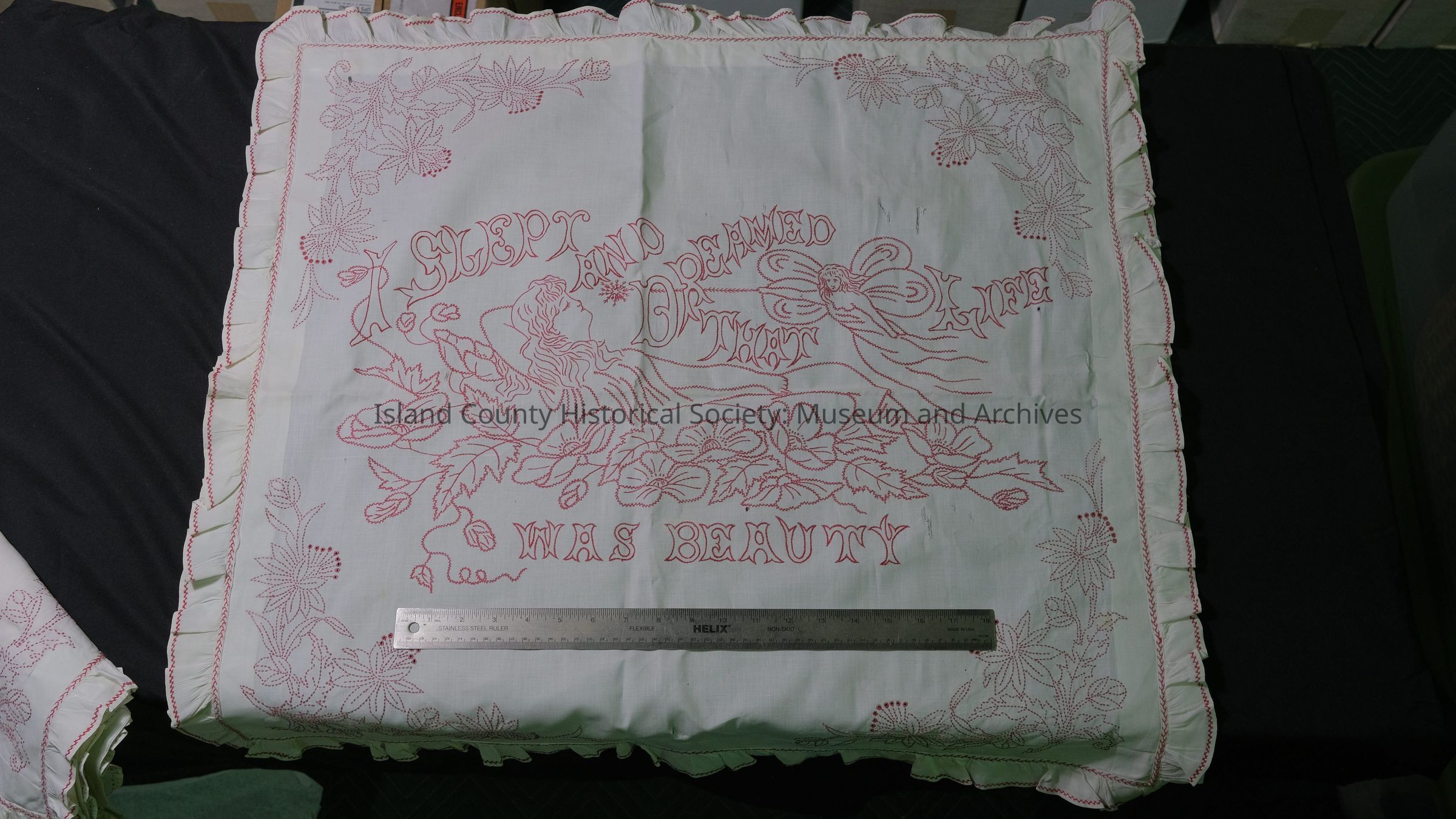 Pillow Shams - white handkerchief linen with red embroidery - 31" x 29", set (A & B) A. "I slept and dreamed that life was beauty" Made by Mrs. Raymond Sherwood, grandmother of Marion V.