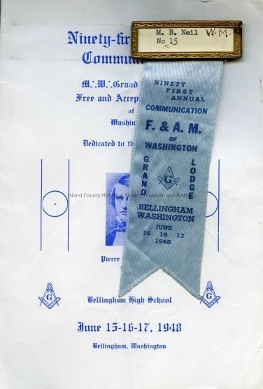 A program, nametag, and ribbon from the Grand Lodge of Washington's 91st Annual Communication, held June 15, 16, and 17, 1948 at Bellingham High School. Nametag states: "M. B. Neil, W.M., No 15". Inside of program features event itinerary and organizational leadership.