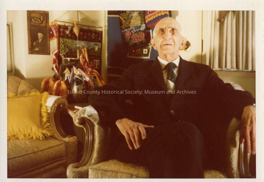 Dr George Heap seated in a chair with several tapestries and flags behind him. 11-1-75 Note written on back says "do not use"