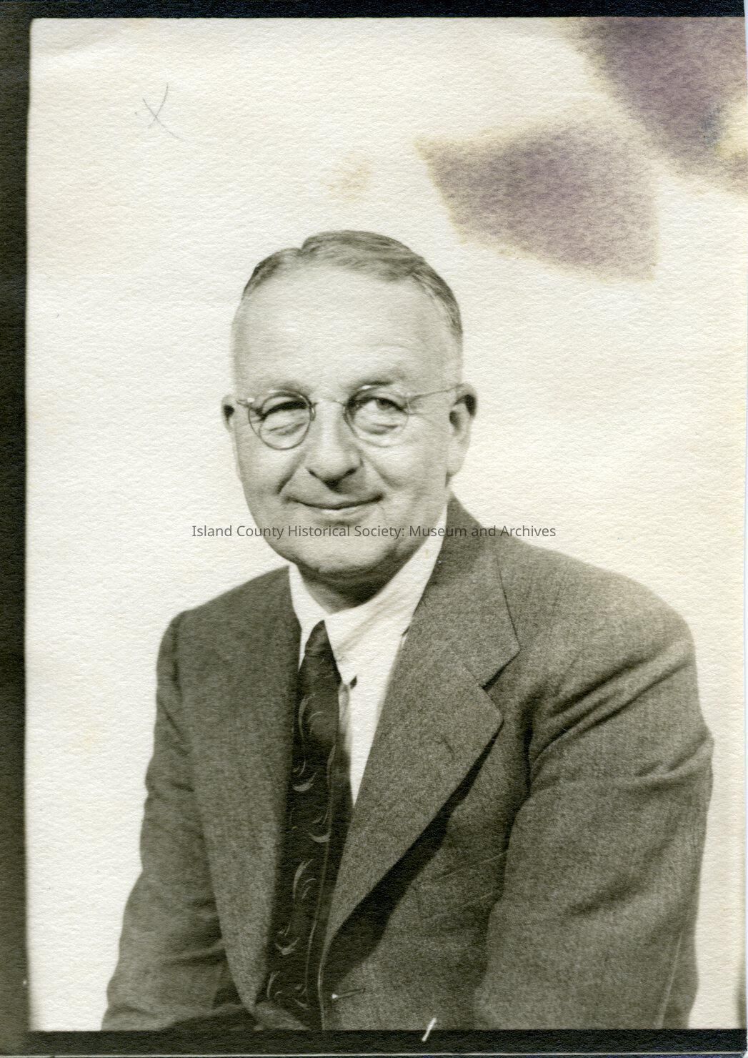 Portrait of unidentified man most likely George Heap, smiling with mouth closed