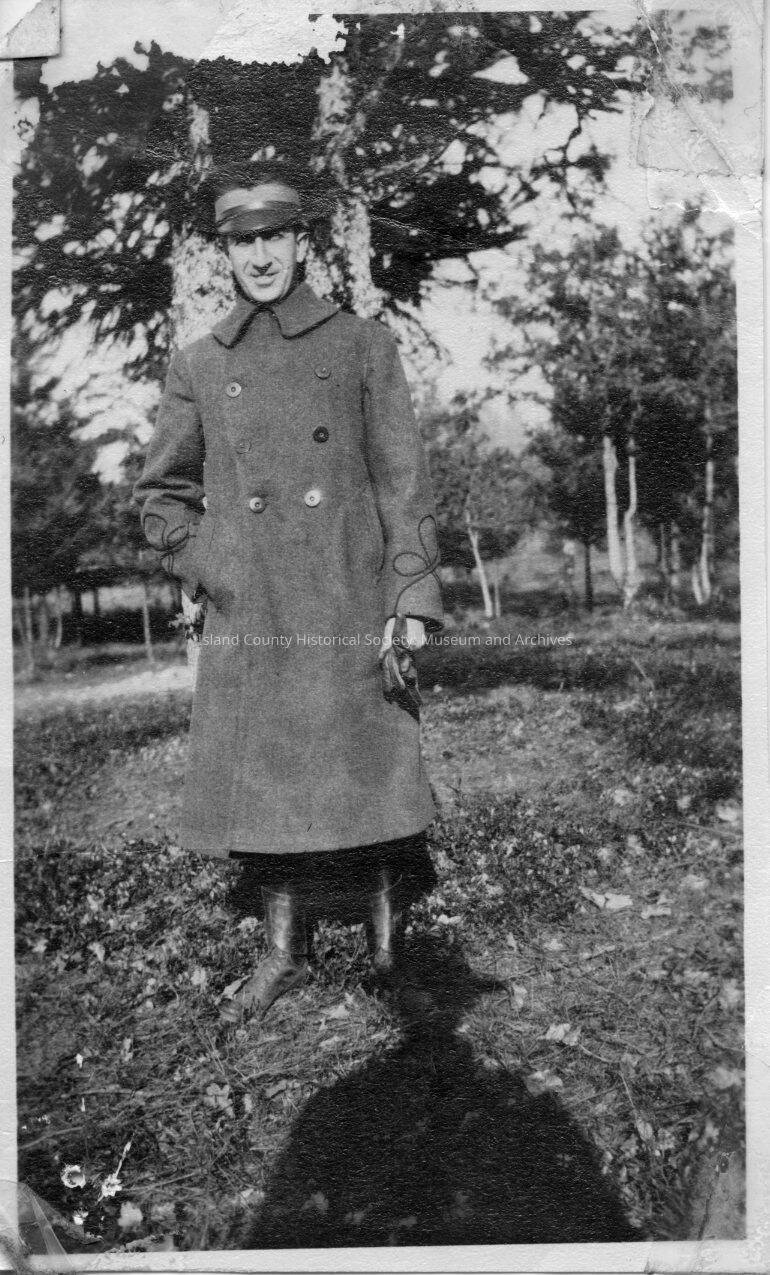 Lt. George R. Heap at Camp Lewiston in1917 wearing an ankle length uniform overcoat and hat. From accession book: Group of pictures with old number 91-6-73A-P from 1891-1983.