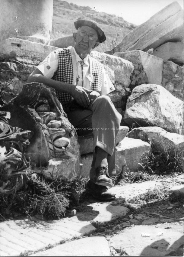 Dr George Heap sitting on rock steps wearing a tam. Back of photo inscribed "Mary A. Mendum, Belmont, Mass." Dated 6/1/67.