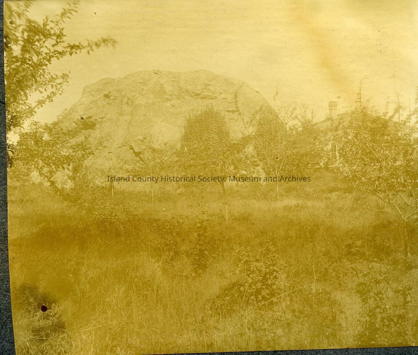 Big Rock near S Main St, Coupeville. House to right and orchard in foreground. Also called Rock of Ages. School was often taught on top of this rock in good weather in early days.