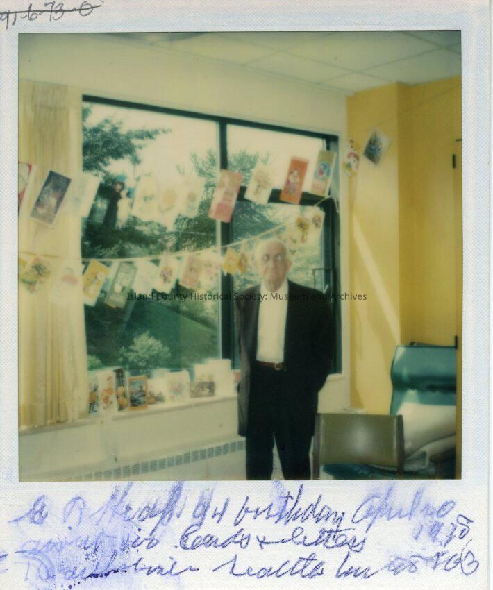 Dr George Heap on his 94th birthday standing next to two strings of birthday cards. Dated April 20, 1978. Polaroid snapshot. From accession book: Group of pictures with old number 91-6-73A-P from 1891-1983.