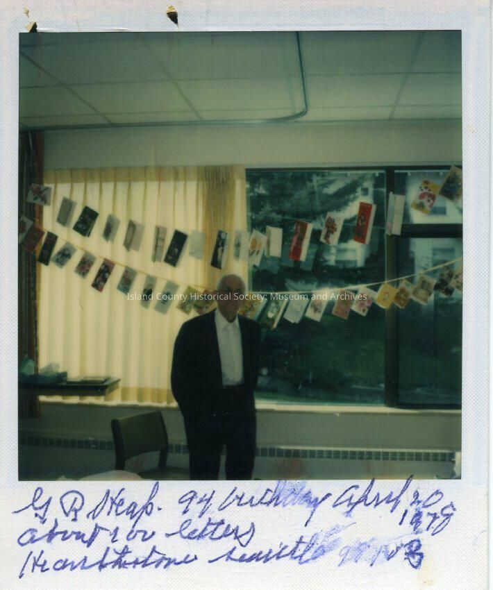 Dr George Heap at his 94th birthday party standing in front of two strands of cards. Dated April 20, 1978. Polaroid snapshot. From accession book: Group of pictures with old number 91-6-73A-P from 1891-1983.