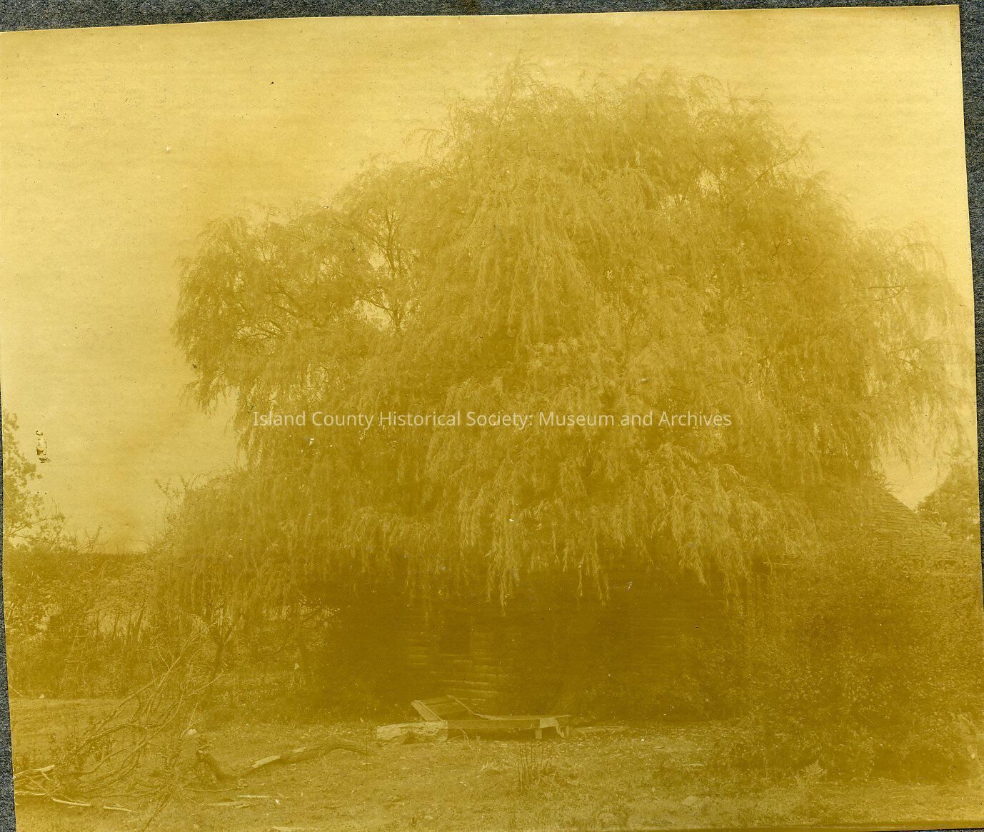 Large willow tree in front of Howard and Calista Lovejoy's log cabin in Coupeville. Large branch and chaise lounge in foreground. Note says: Willow tree grown from a slip taken from Napoleon's grave by Capt. Simeon B. Kinney. Old lovejoy home in Coupeville just before taken down. Ed, Ben, and Nell Lovejoy born there.