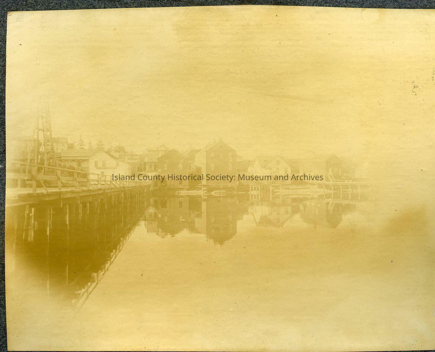 Looking toward Front St. in Coupeville from water. Robertson dock is on left. Tall tower on dock. Buildings on Front St reflected in water.
