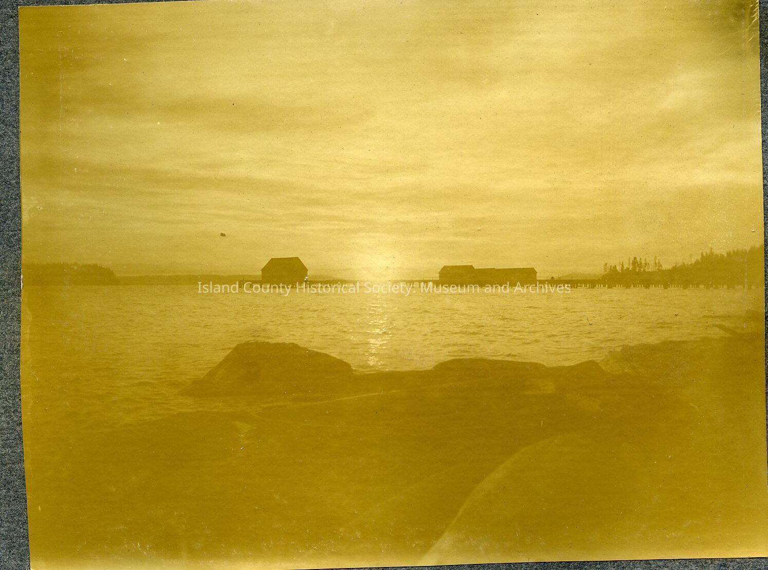 Long dock with building near end. Another building mid-dock or on a dock in rear. Large rocks on shore in foreground. Rising or setting sun reflects across water.