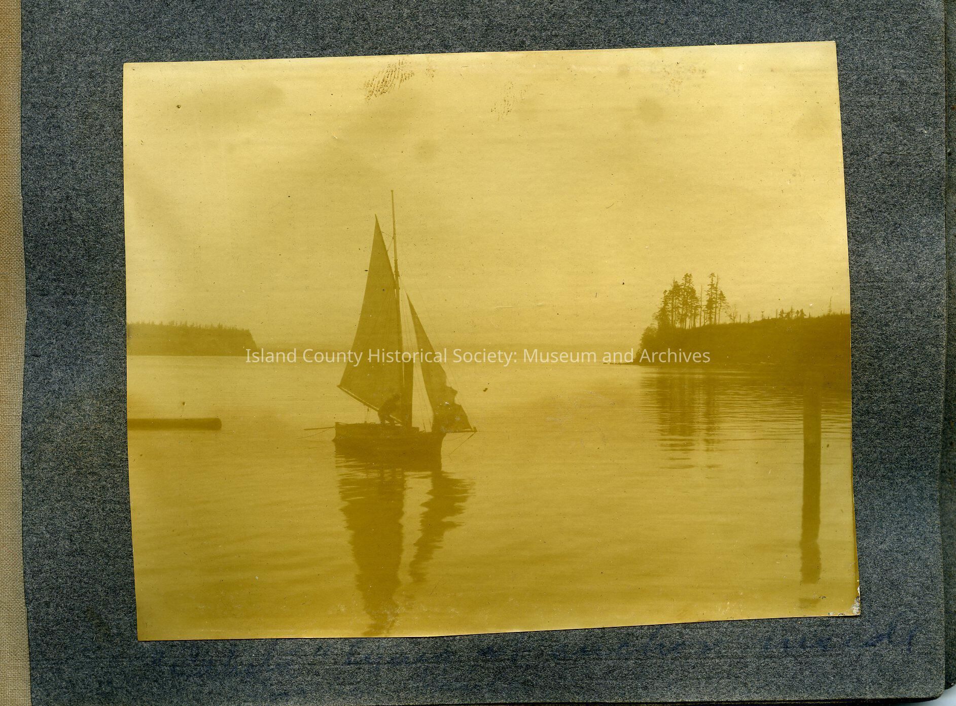 Small sailboat on calm water. Sails reflect in water. Man stands and works near mast. Points of land in background.