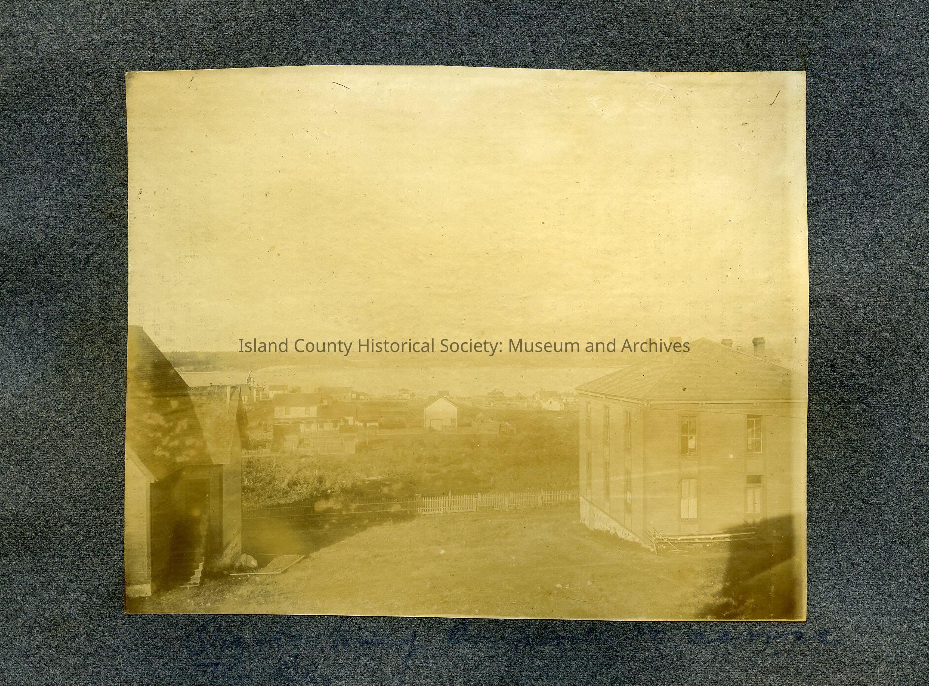 View of Coupeville from Puget Sound Academy. Church and dormitory in foreground, buildings and Penn Cove in background.