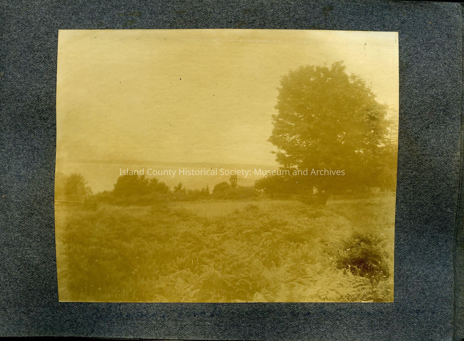 Looking across a field toward the water. Large tree to right. Dock visible on water.