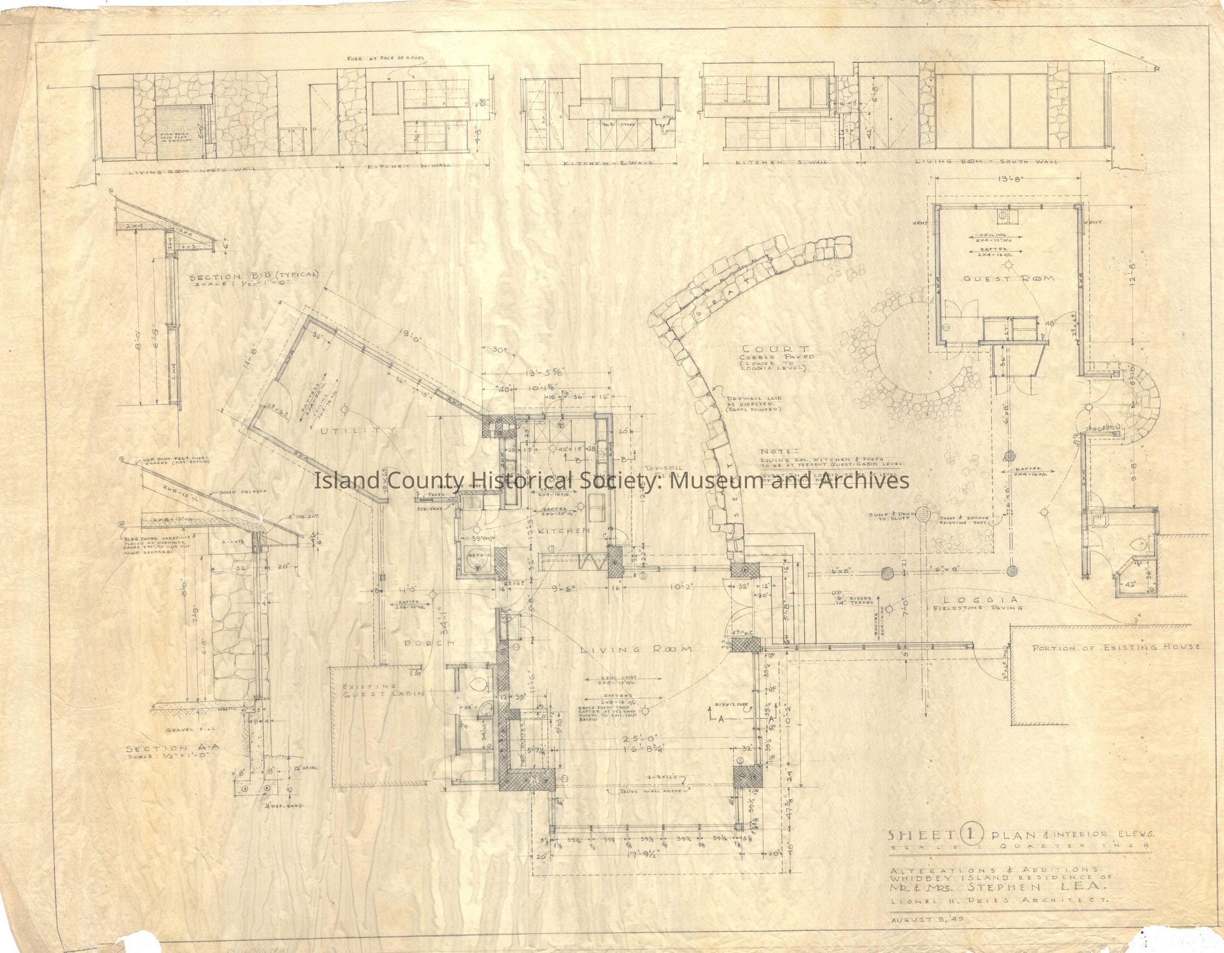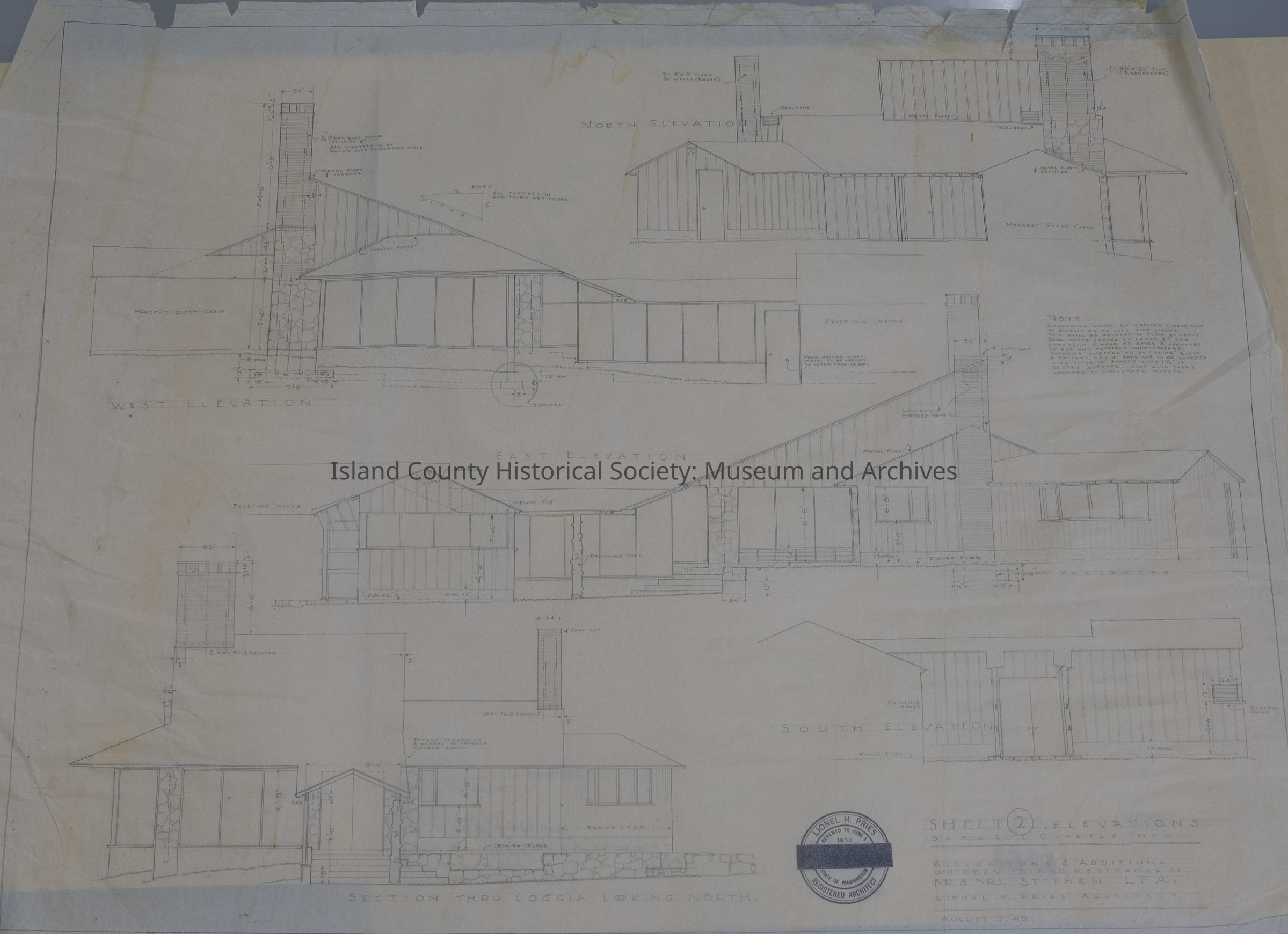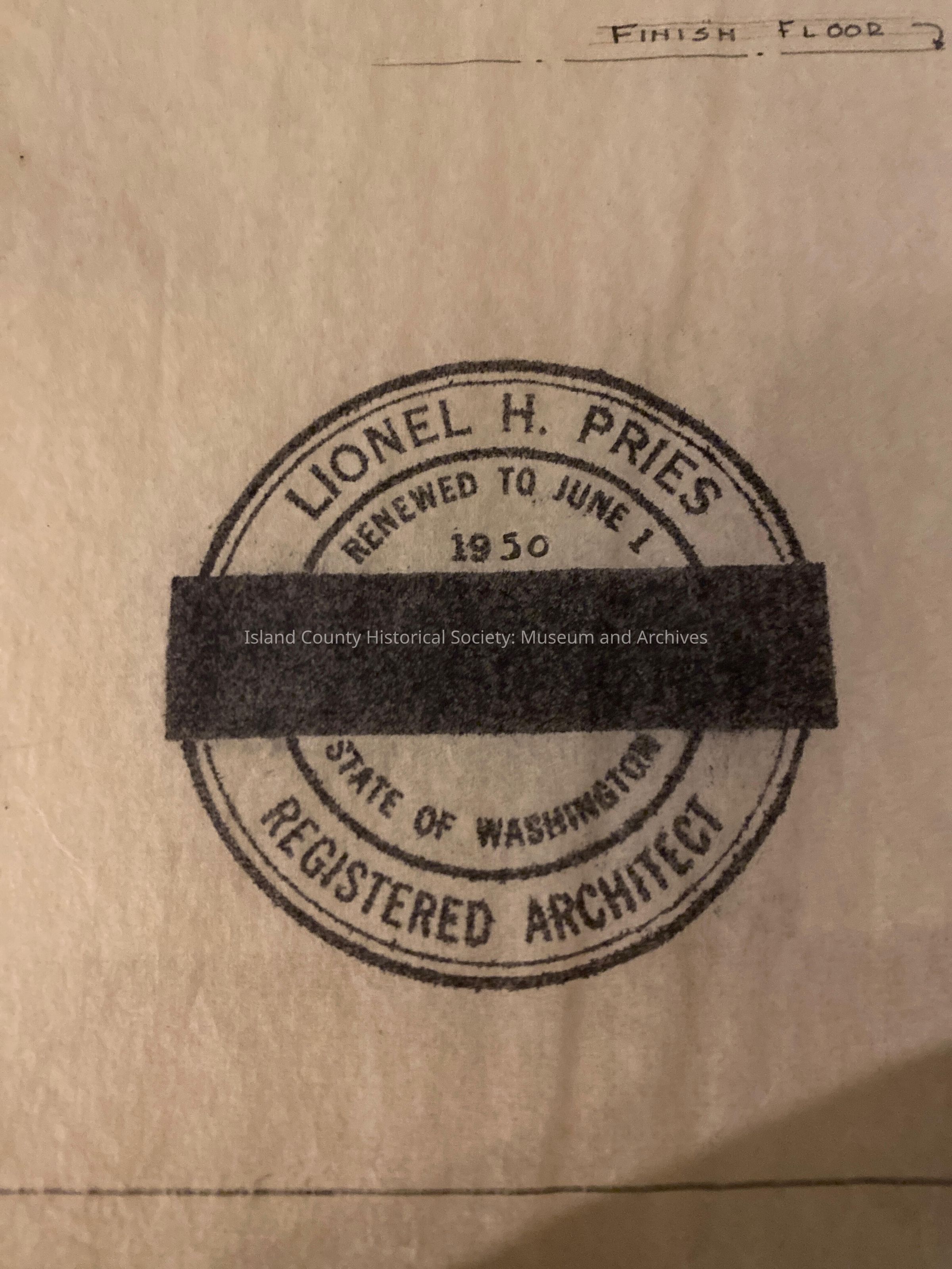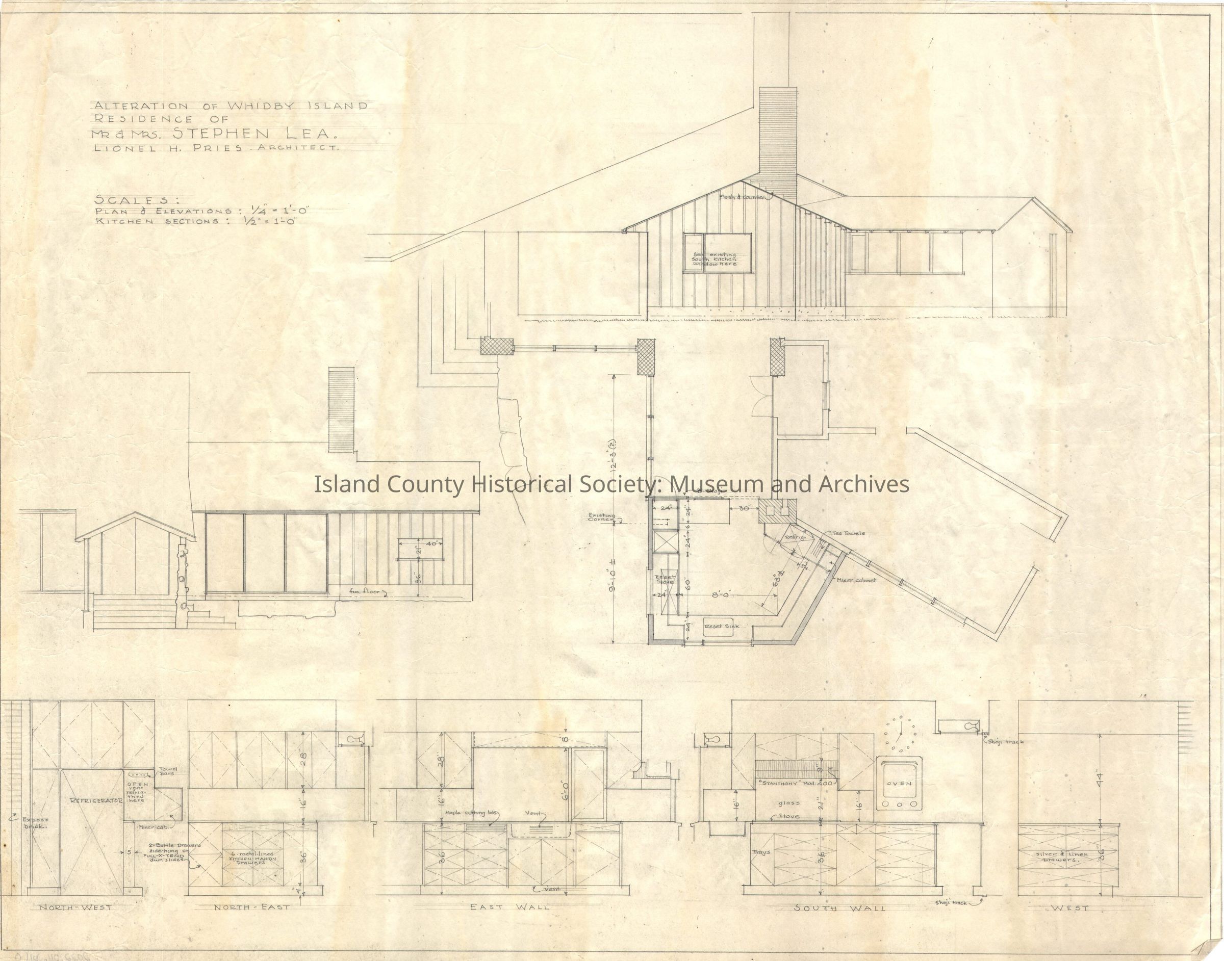 A collection of architectural drawings of the Lea building on the Robertson land claim, drawn by Lionel Pries
